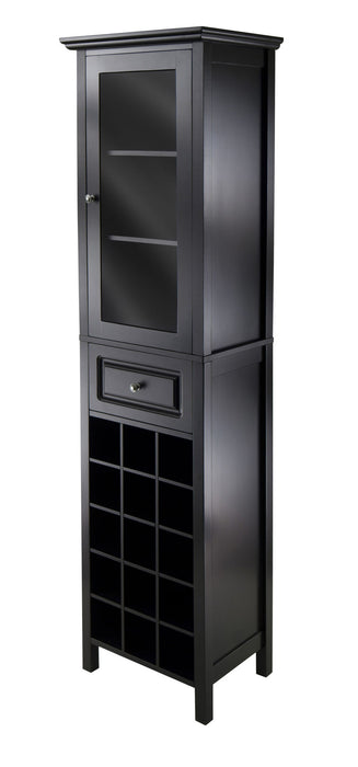 The handsome and elegant Burgundy Wine Tower is compact and perfect for storing your wine and accessories. Top cabinet with clear glass door opens to 3 fixed shelves with 13.5"W x 10.9" for wine glass storage. One drawer with inside dimension of 12.3"W x 9"D x 6.1"H. Bottom section holds 15 wine bottles. Made with combination of solid and composite wood in black finish. Overall assembled size is 18.1"W x 12.9"D x 66.8"H. Assembly required.
