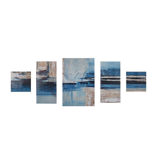 View full detailsAdd tranquility to your living room with Overseas, a five piece canvas set. Overseas features a texture and abstract art with beautiful hues of blu...