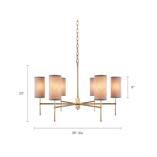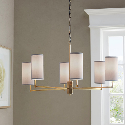 View full detailsThe Hampton Hill Conrad Chandelier helps to refine your space by providing a simple, but elegant update. Six grey drum-shaped fabric shades sit...