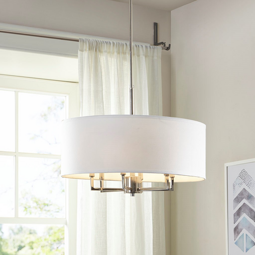 View full detailsThe Hampton Hill Broderick Chandelier provides a simple, yet beautiful addtion to your hoem décor. Featuring a white cylindrical fabric ...