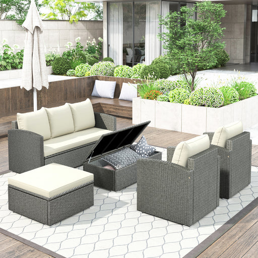 View full detailsOutdoor 6-piece Rattan Sofa Set Designed with a 1*3-seat sofa, 2 armchairs, 2 stools, 1 tempered glass table, 5 pillows and 5 cushions( including ...