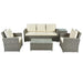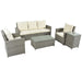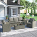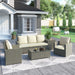 Spend your outdoor leisure time with your family members and friends with this simple and classical style set of PE rattan wicker sofa. This 5-piece patio furniture set is able to accommodate 5 people and brings ease and a comfortable atmosphere to your outdoor places, and it offers a perfect place to unwind after busy work. This modern set of sofas is crafted with all-weather PE rattan over a steel frame to guarantee longevity usage. The thick and high-density sponge-filled in cushions make you enjoy a soft sitting experience, and the covers of these cushions are water-resistant to ensure easy cleaning. This modern and simple design set of PE rattan sofa is multifunctional, you can switch the placement combination at will.