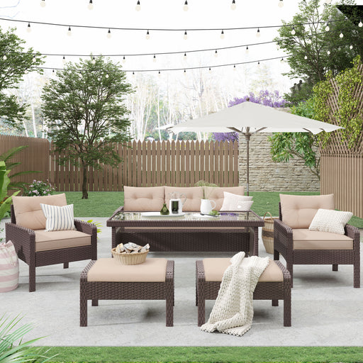 View full detailsOutdoor 6-piece Rattan Sofa Set Designed with a 1*3-seat sofa, 2 armchairs, 2 stools, 1 tempered glass table, 5 pillows and 5 cushions( including ...