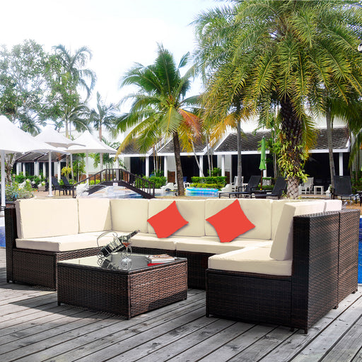 View full detailsOutdoor 6-piece Rattan Sofa Set Designed with a 1*3-seat sofa, 2 armchairs, 2 stools, 1 tempered glass table, 5 pillows and 5 cushions( including ...