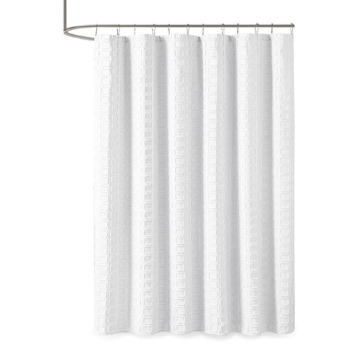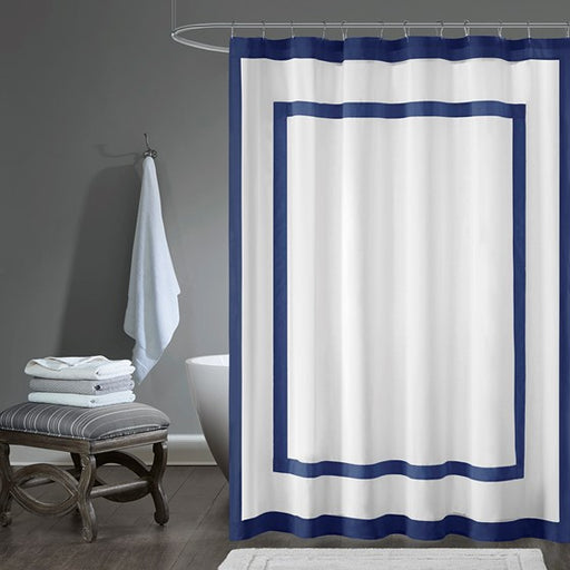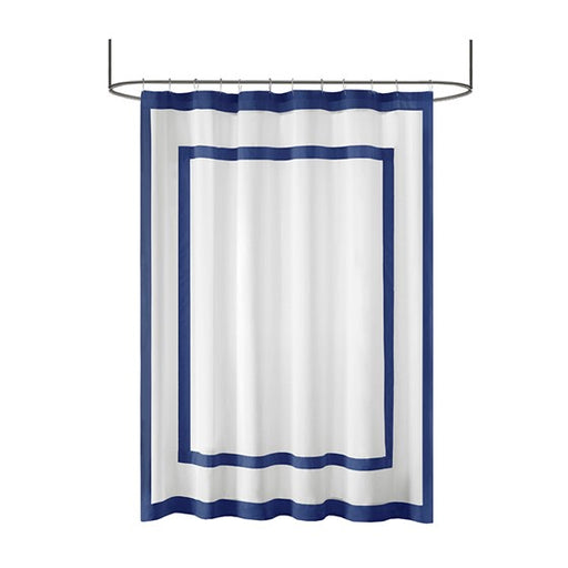 Elevate your bathroom decor with the Madison Park Metro Woven Clipped Solid Shower Curtain. This solid navy shower curtain features a woven square ...