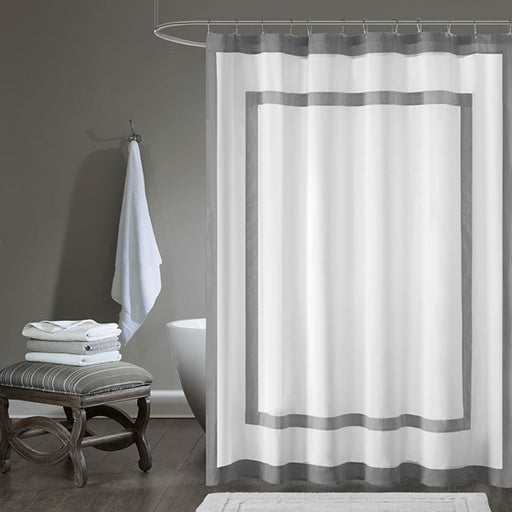 The Madison Park Greyson shower curtain creates a contemporary update to your space. Pieced, cotton duck fabric in solid white is in the center whi...
