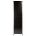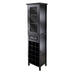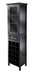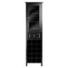 The handsome and elegant Burgundy Wine Tower is compact and perfect for storing your wine and accessories. Top cabinet with clear glass door opens to 3 fixed shelves with 13.5"W x 10.9" for wine glass storage. One drawer with inside dimension of 12.3"W x 9"D x 6.1"H. Bottom section holds 15 wine bottles. Made with combination of solid and composite wood in black finish. Overall assembled size is 18.1"W x 12.9"D x 66.8"H. Assembly required.