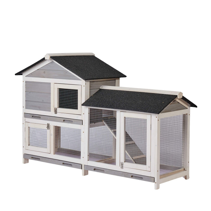 This outdoor chicken coop is perfect for use with rabbits, chicken, guinea pigs, and other small animals. This great 2-story chicken coop features sturdy construction from wooden coated with a water-based preservative to ensure long-lasting use whether used indoors or outside in the elements. Come and try our Pet Rabbit Hutch Chicken Coop Cage Hen House!1. Durable ConstructionThis chicken coop is made of good quality Fir wood with security waterproof paint. Heavy-duty galvanized wire fencing is not only vital to the ventilation of poultry, but it will also protect your animals from outside predators and stop your pets from ruining your garden.2. Suitable for a Variety of AnimalThe chicken coop measures 62.6"L x 20.8" D x 37" H, which is ideal for small animals such as rabbits, guinea pigs, chicks, ducks, and other poultry. The chicken coop suits your raising rabbits, guinea pigs, chickens, ducks, poultry, or other pet. 3. Specific RoofThe chicken coop main door of the living room uses the original wood-making process. The attached run opens from above for easy access. Asphalt sloping roof to protect from water penetration. Also, your pets could get more sunlight when the weather is clear.4. Spacious SpaceThe chicken coop has a resting room and running area in which your chickens or any pets could play freely in the coop. The running area connects to the living room with a ramp. There are timber rides above the ramp that can protect your poultry from slipping back.5. Easy to CleanThis chicken coop has 3 easy to open doors to gain quick access to your pets, two are able to open up the outer run area and the other is to open the inner loft area. The large main living area has a removable pull-out tray to make cleaning simple and quick.6. Easy AssemblyDo not worry about installation! This chicken coop is very easy to assemble, you can install it according to the installation instructions we provide.7. Locking DoorThe rabbit cage secure lock prevents unwanted guests from entering your chicken coop. Hurry to create a Kingdom of life for your pets! 8. 100% Service Guarantee If you have any questions about our chicken coop, feel free to contact us. Our professional customer service team will provide you with solutions within 24 hours. The chicken coop due to the difference between the light and the screen pixels, there may be a little chromatic aberration, which is normal, everything is subject to the real thing.Specifications:- Item Name: Chicken Coop- Material: Fir wood and Wire Mesh - Color: Gray /White- Dimensions: 58" x 21.9" x 37"Package Size: (Package No, LxWXH, Gross Weight)- 1 Package: 37.4x29x9.5inches, G.W: 61.7lbs N.W: 57.3lbsPackage Includes:- 1 x Wooden Chicken Coop- 1 x Installation Instruction