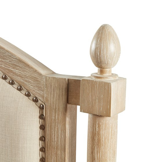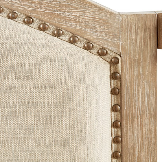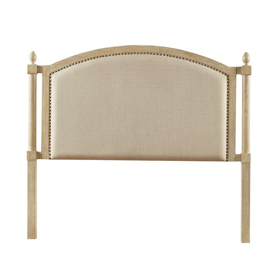 The Madison Park Cirque Queen Headboard offers a charming farmhouse style update to your bedroom decor. This queen-sized headboard features an upholstered panel in a natural hue with a bronze nail head trip that adds an elegant touch to the design. The solid wood legs and frame showcase a reclaimed wheat wood finish that creates a rich transitional look. Simple and refined, this queen headboard is perfect for elevating the decor of your bedroom. Assembly is required. Spot clean only by wiping with a damp cloth.