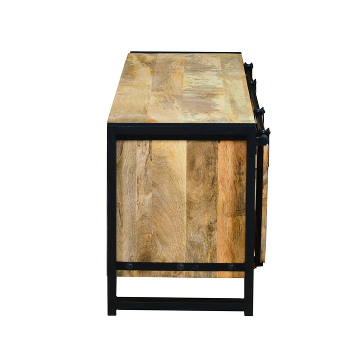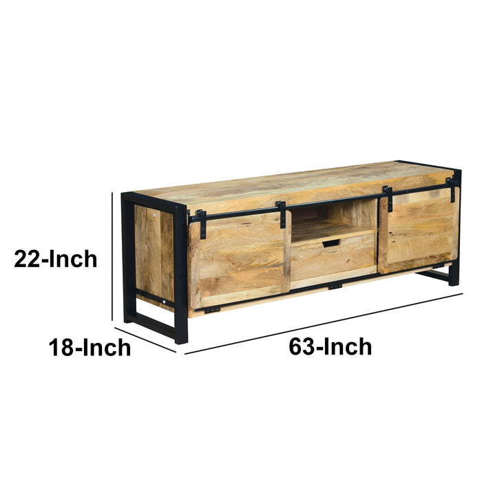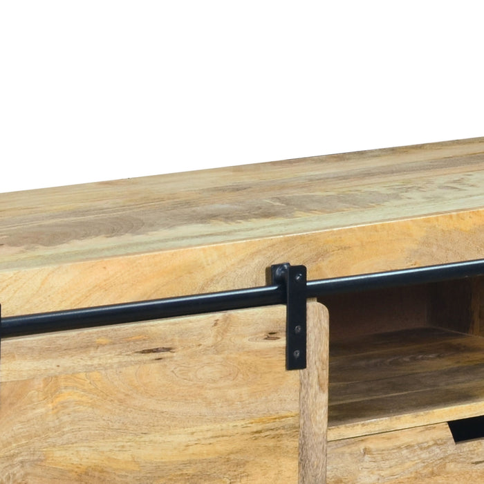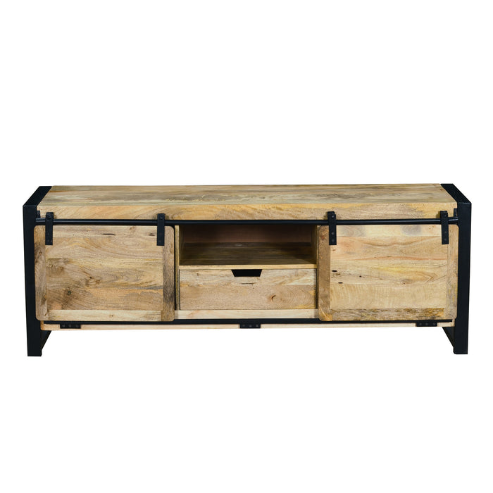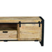 Designed with perfection, this industrial style inspired TV Cabinet will add a refined look to your interior. The essentials of clean lined design and aesthetically pleasing grain details combine together to form this TV Cabinet. Incorporated with 2 barn sliding door storage, 1 smooth gliding drawer, and an open cubby for your media necessities, this TV Cabinet is supported on a sled base. Constructed sturdily from the combination of mango wood and iron frame for lasting durability, the dual tone finish in the hues of oak brown and black grant a riveting edge to it. Even though it is inspired by industrial style, it blends with a variety of decor settings.