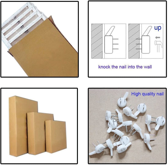 High-definition pictures were printed on high-quality canvas with Environmentally friendly ink. Each product is equipped with hooks and stainless nails easy to hang.