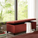 This modern storage ottoman accentuated with button tufting provides ample storage and features an elegant rust red fabric with rich espresso legs. No assembly required.